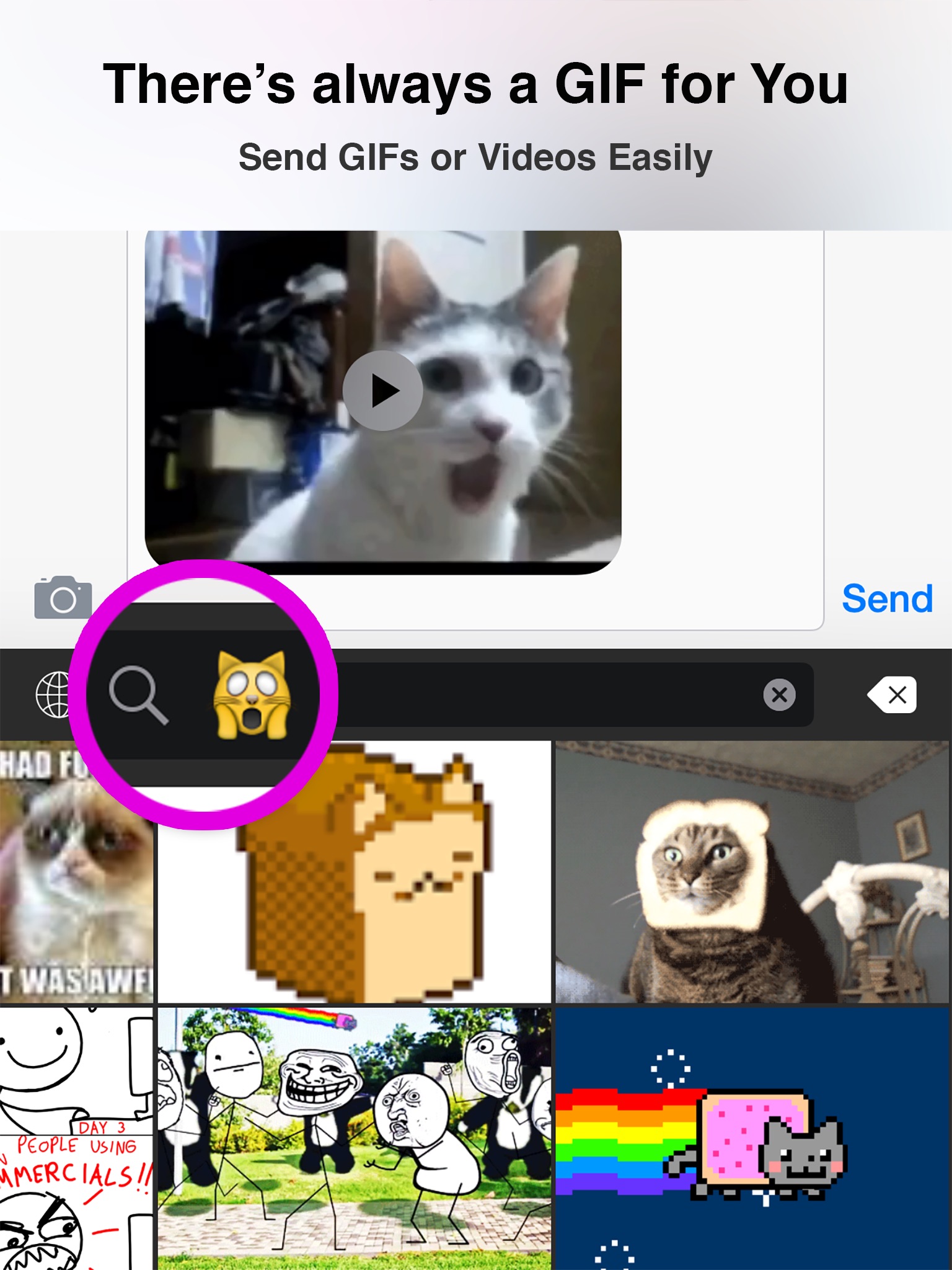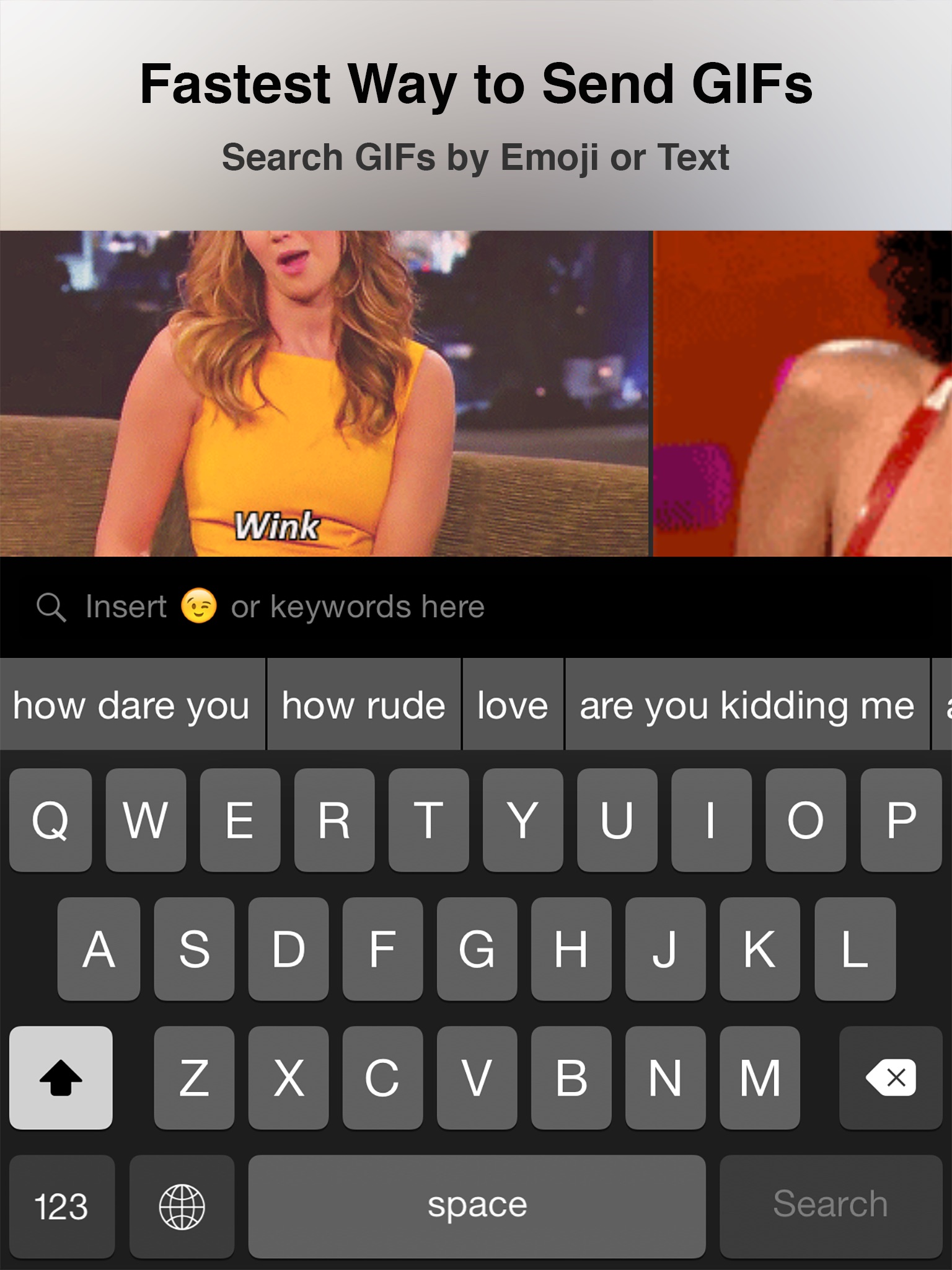 WayD GIF Keyboard allows you to search GIFs by emojis from the emoji keyboard. You can also search GIFs by text with auto completion and word suggestions.