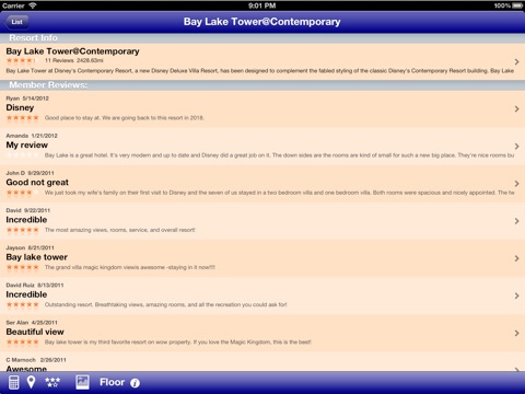 -) Summary screen for each resort which allows you to easily access all of the information for that resort through an intuitive toolbar. This displays part of our resort description and a list of member reviews. Tapping on either of these will bring up the complete description or member review.