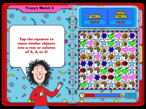 • TRACYS MATCH 3 GAME – Match 3,4 or 5 fun shapes in a row or column to score as many points as you can in 60 seconds!