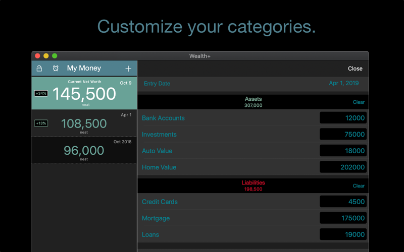 Wealth+ makes it simple to track your net worth over time. Beautiful charts let you see how your wealth is trending over a number of categories: banking, investments, auto, mortgage, loans and more. Add your own categories, too. At a glance see how your current net worth compares to last month and use it inform your savings and investment strategies. Simple and beautiful.