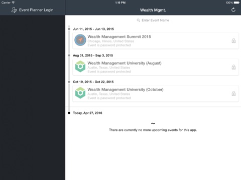 Use this app to stay up-to-date on the latest Wealth Management Platform events. Access event information including agenda, speaker bios, and attendee contact information.