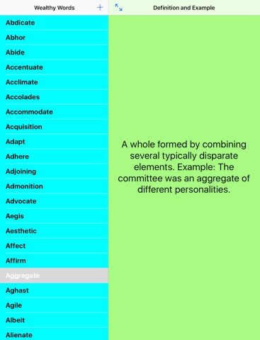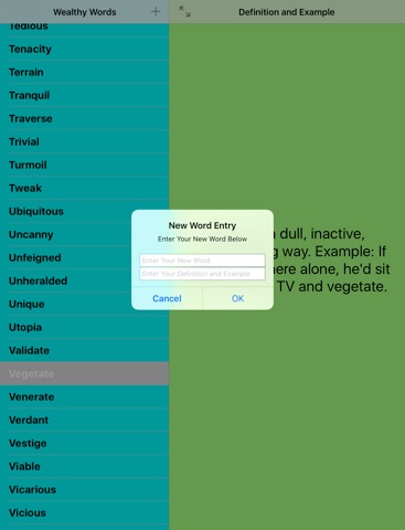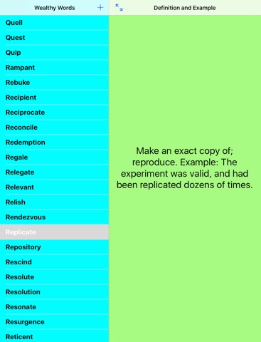 To add a word, just use the add button. The easiest way is to use your microphone to speak the word and definition. Many times you’ll have a vague idea what the word means. If you are on the go, you may want to enter the word and your simple idea of a definition. Then later on, you can look up the real definition and improve your own definition. Just the physical act of saving the new word into Wealthy Words will increase your brain connections to that word, and will help you to remember it.
