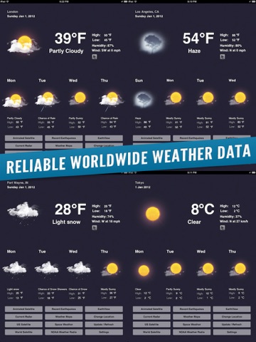 Reliable weather data is provided for most cities and countries worldwide. Traveling and need the weather? No problem. Support for virtually every location on earth by entering the name: i.e. "Tokyo" or "Dallas" or if you live in the United States and the United Kingdom, your local zip code.