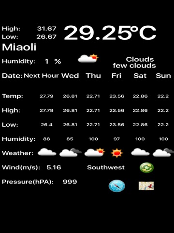 * It can show current ,next hour, the next 5 days high,low,temperature,pressure,humidity,your city,wind direction.
