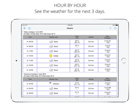 • Hourly forecast including temperature, wind chill, and UV index