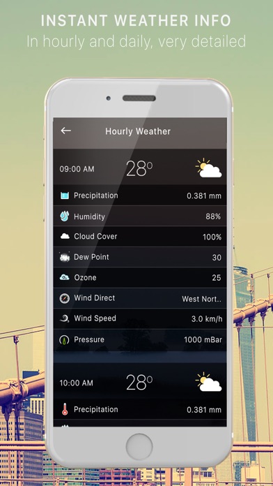 - Timely and accurate overall weather condition: real-time temperature, wind speed, humidity, dew point, sunrise, sunset, UV index, precipitation percentages, visibility and barometric pressure.