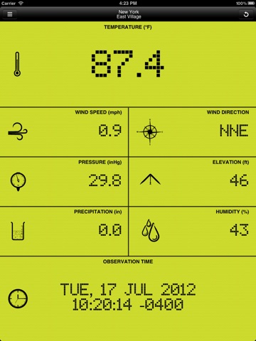 I really like it for monitoring my own station and checking others. A basic display that does just what the ad says. A couple oddities: you cant select a station by its "CW" number here in the US, type in a text description "Weston, South, MA, US". Wind direction is in text (NNE) only, degrees is not an option. Time is 24 hr format only. I cant determine how often it updates so far - Id guess 5 min or less increments, which may be limited by the individual stations. There is no memory so unless you make notes there is no way to see trends, not even a barometer "up" or "dn" arrow.