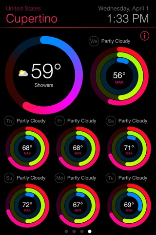- Shows current conditions using beautiful circular metrics