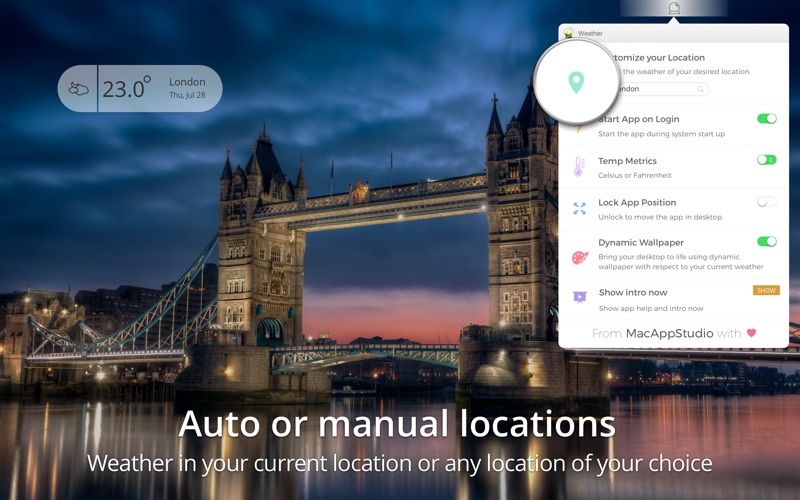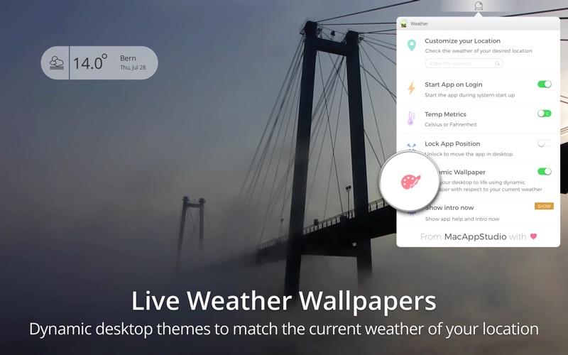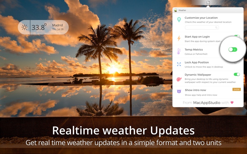 WeatherDesk is a simple and beautiful desktop app to show real time weather updates for the current location.Weather app is designed to ensure that it looks stunning with your desktop wallpaper.