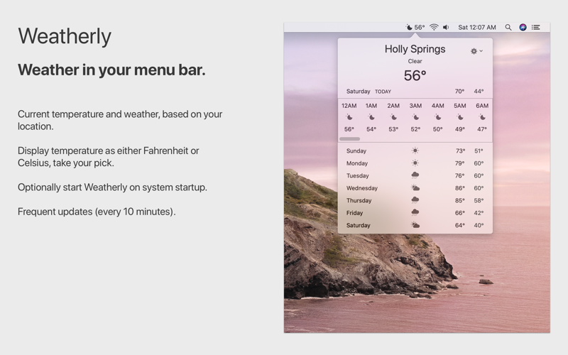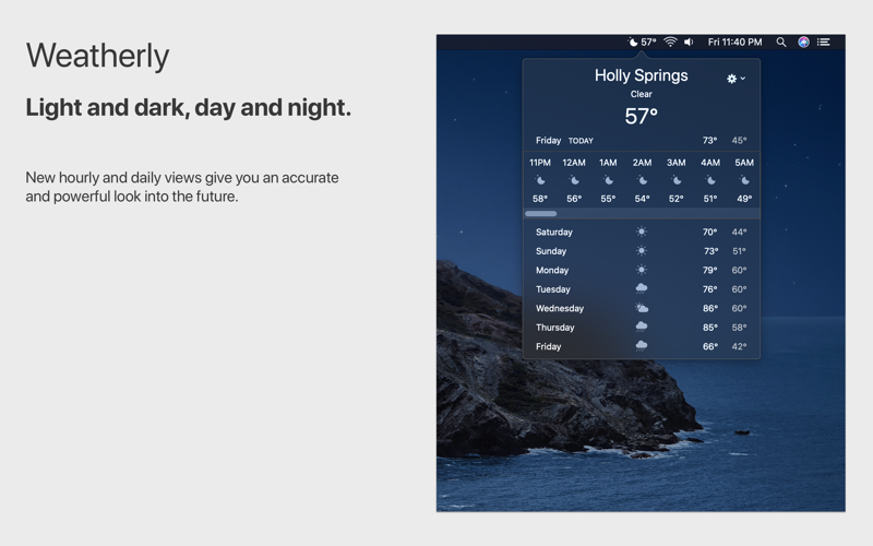 Weatherly is a simple and elegant solution for seeing the current weather right from your desktops menu bar. Customize the menu bar to show current conditions, temperature, "feels like" temperature, or humidity. The app uses your current location to provide incredibly accurate forecasts. An essential app for every Mac owner.