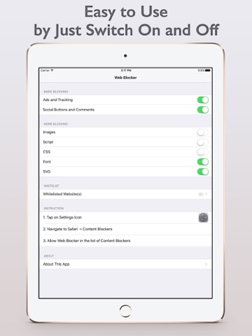 The Ads Blocker can help to optimize the web browsing experience to new level by save more cellular and WiFi data consumption and, loading and display information so much faster.