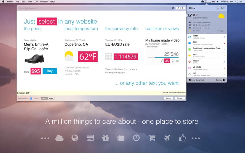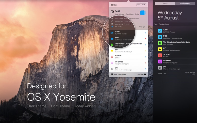 Web Tracker helps you to extract, collect and synchronize any short text of information on almost any website you like. It will automatically check changes and show the newest data for you. Your desired shoe price, the visitor count in your youtube channel, the currency exchange rate, whether in your area, or any other text block that is selectable, all will be monitored with this application. No need to visit that site anymore; “Web Tracker” will check it for you! To save your working space this application runs in the status menu bar and in "Today extensions" sidebar. “Web Tracker" works with non-password protected websites.