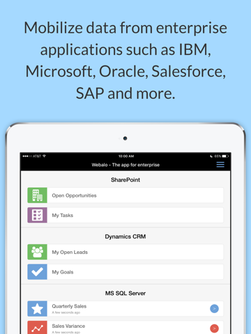 Webalo enables IT organizations, business units and departments to generate their own apps automatically, seamlessly and securely connecting and inter-operating with enterprise applications from vendors such as IBM, Oracle, SAP, Microsoft and Salesforce.com, as well as custom applications, making this data available, relevant and actionable and businesses more productive by helping employees to make better, more informed, decisions.