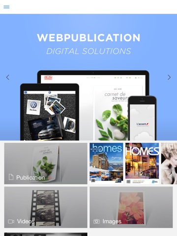 Built with a flexible and cross-platform HTML5 structure, Webpublications library applications are the ideal container for all your digital assests: publications, videos, images, feeds of news and much more.