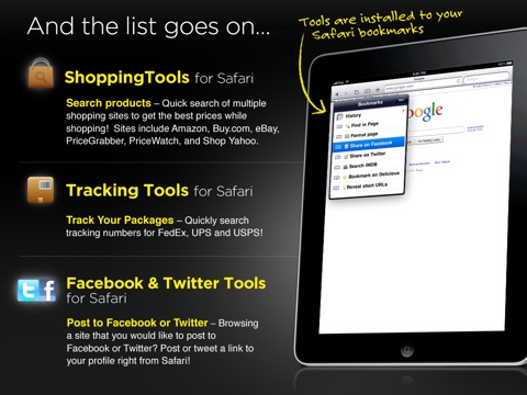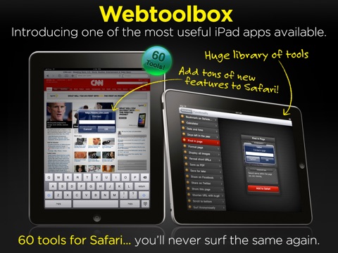 Ever wish the Safari browser for iPhone, iTouch or iPad was more like a desktop browser? Now it can be! WebToolbox+ is a collection of tools for Safari that will make your web browsing experience quicker, easier, and more useful than ever before. Once a tool is installed in Safari, you never have to open WebToolbox+ again - just open your Safari bookmarks to access it. You will never browse the internet the same again!