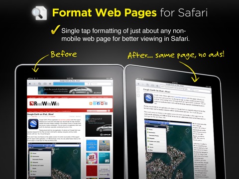 √ FORMAT ANY WEB PAGE FOR YOUR PHONE - Have you ever been reading a news article in Safari, and wished there was a way to get rid of all of the clutter and just see the content formatted for your screen? With the "Format Page" tool you can reformat the page you are viewing to get rid of annoying ads and resize the page for better viewing on your screen.