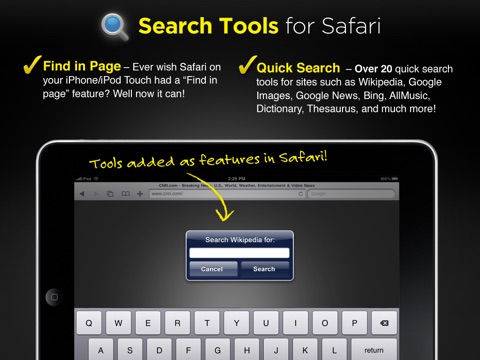 √ FIND IN PAGE - Ever wished Safari on your iPhone/iTouch/iPad had a "Find in Page" feature like your desktop browser? Well now it can!