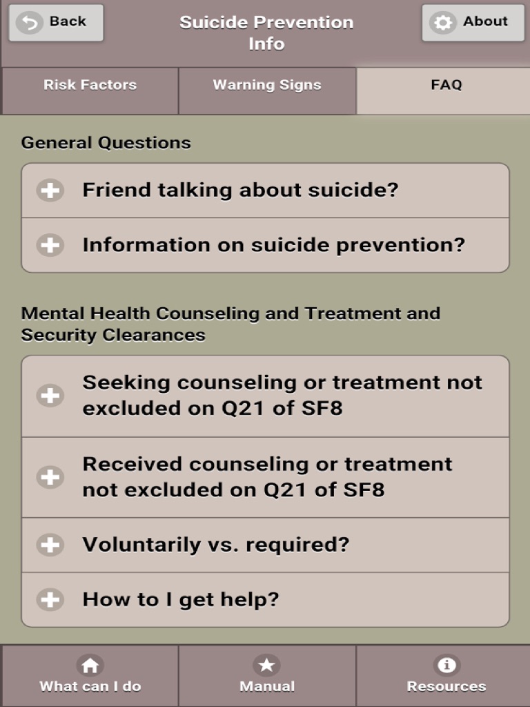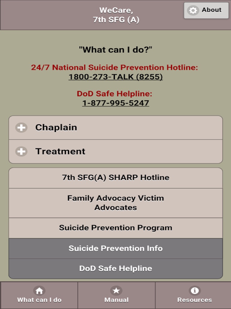 This app is to support the Suicide / Sexual Assault Prevention Campaign and serves as an educational and resource tool to reduce high risk behaviors with the ultimate goal of eliminating sexual harassment and sexual assault amongst our ranks.