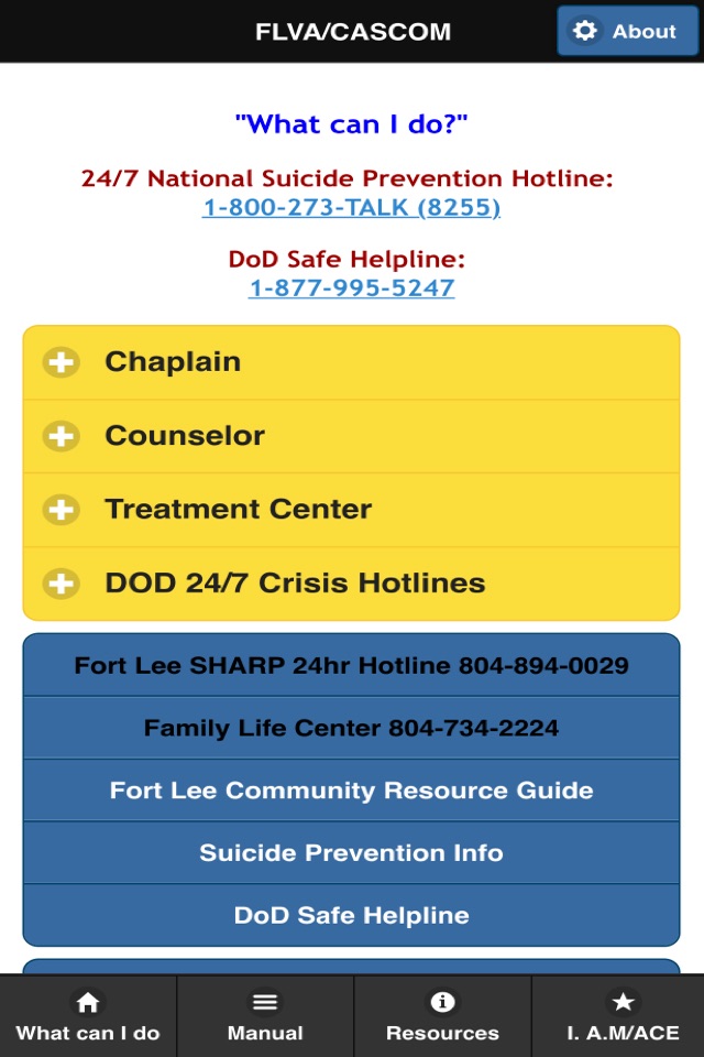 This App promotes the CASCOM and Fort Gregg-Adams Suicide Prevention Program Strategy to do everything in our power to assist leaders in the identification, assessment and engagement of "high risk" and "at risk" individuals in order to predict, prevent and reduce the occurrences of suicides among Soldiers, DA Civilians and Army Family members assigned to CASCOM and Fort Gregg-Adams units.