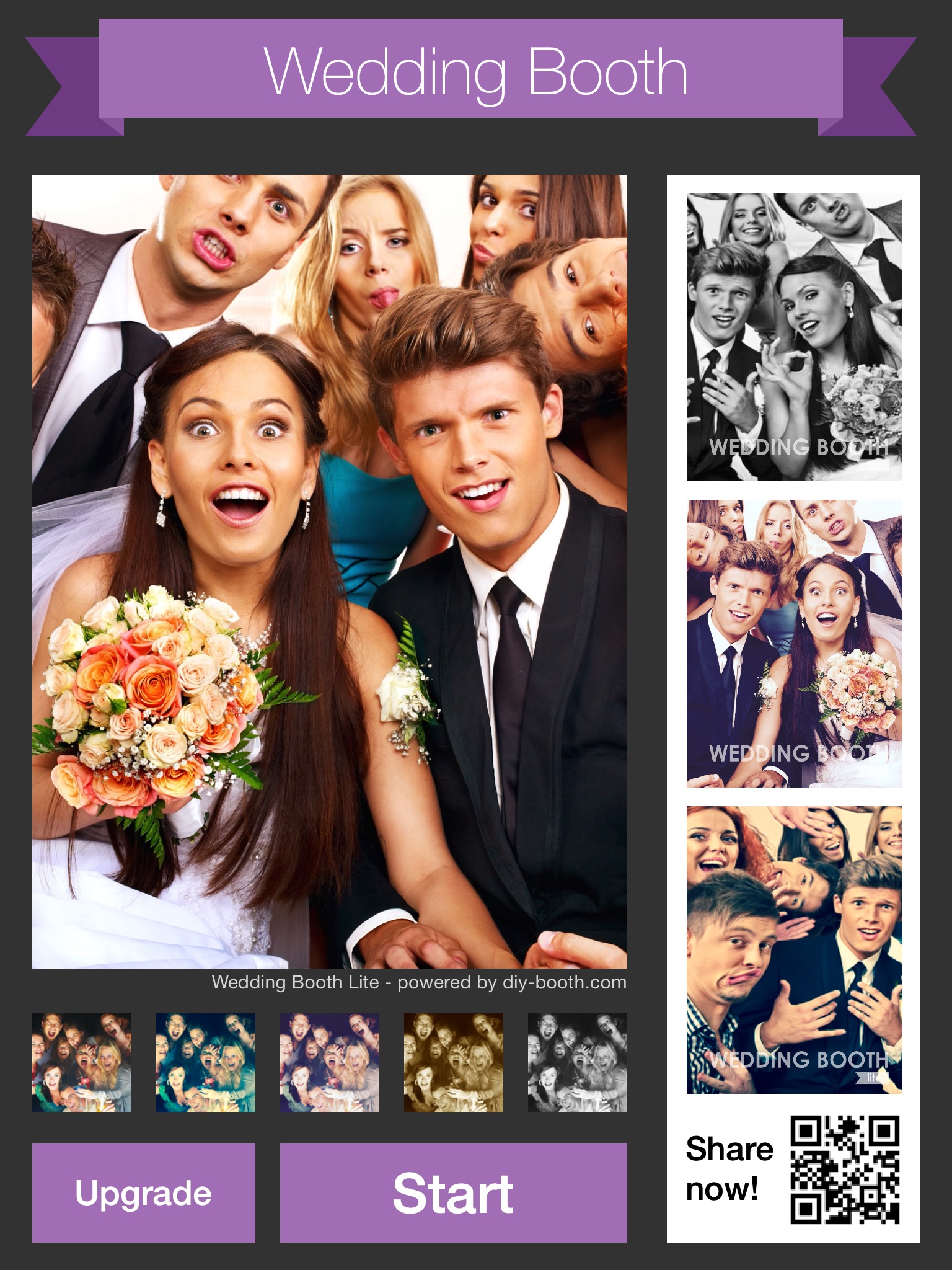 Wedding Booth Lite creates pictures with watermarks. Purchase Wedding Booth Pro to get pictures without watermarks.