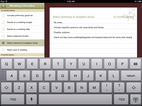 Tick off checklist items as you complete them to track your wedding planning progress. You can access your completed items and notes later and modify them at any time.