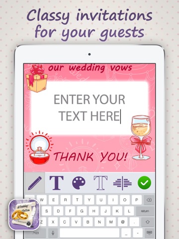 Browse through the gallery of greeting and invitation cards and find the perfect one. Its just like with the wedding gown - youll know thats the one the moment you see it. White, simple, deluxe? The choice is all yours. There is not a second more to waste. Download Wedding Invitation Maker app now totally FREE, install, and start creating dazzling personalized invitation cards.