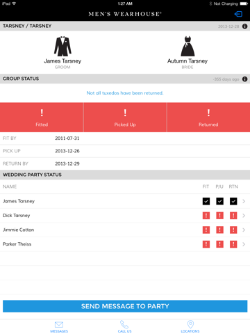 • Fitted > Picked-Up > Returned – See where each person in your wedding group is in the tux rental process.