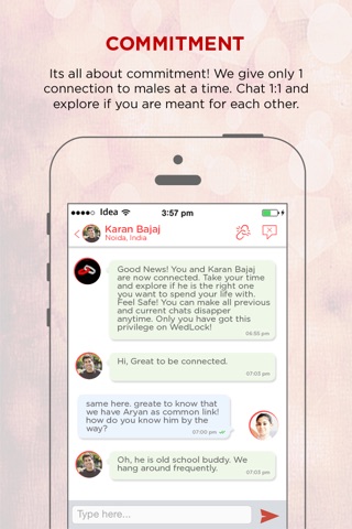 WedLock recommends you eligible educated singles looking to find a life partner. Get connected only if you mutually like each other. WedLock is currently open to only singles with age 24 years or above. We give only 1 connection at a time to males. After all, what matters is commitment! . Engage in private chat. Break connection anytime if it is not working out.