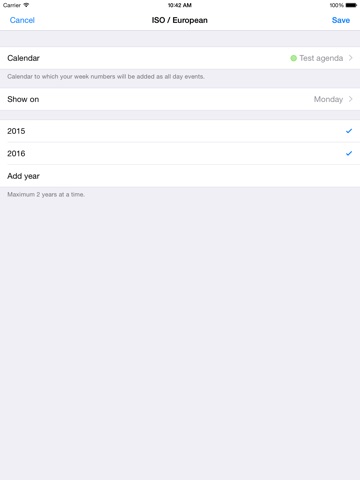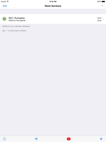 Insert your Week Numbers into your iPhone calendar with one tap. The Week Numbers will be added as free all-day events into the calendar of your choice. So you dont need any subscriptions or internet.