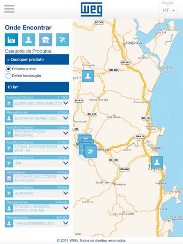 We also make available an interactive map that will enable the user to find dealers, representatives, authorized service centers and WEG units.