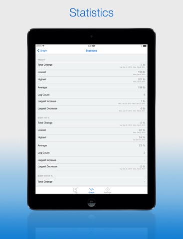 • Statistics calculate min, max, and average weight, total weight change, and more*