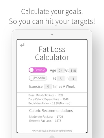 Our newest feature is the Fat Loss Calculator! Through the computations of your body mass index (BMI) and basal metabolic rate (BMR), our calculator can give you an idea of your daily caloric intake to reach different levels of fat loss. Always consult your physician before committing to a diet!