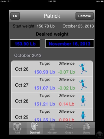 - The user can add a target weight to be reached in the future. It generates a series of weight values suggested for each day in order to achieve the target value (comparison with real measurements are displayed on a tableView)