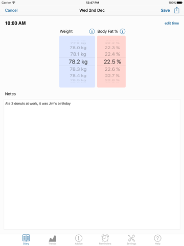 - Track your weight and body fat over time.