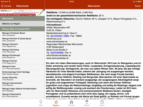Lassen Sie sich die Standorte der 381 Weingüter in der Map anzeigen und wählen Sie gleich die passende Route auf ihrem iPhone. Wählen Sie aus über 3.800 Weinen ihre Favoriten aus. Suchen Sie nach Preis, Sorte, Jahrgang, Weinbauregion, Weinname oder Weingut. Halten Sie sich an die Empfehlungen unserer AutorInnen was Preis-Leistung oder Lagerpotenzial betrifft. Oder folgen Sie den Tipps der Verkoster bzw. suchen die Neu- und Aufsteiger des Jahres.