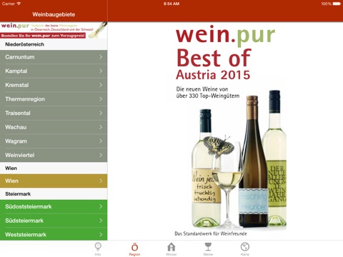 Die wein.pur App „Best of Austria 2015“ führt Sie zu den besten Weingütern Österreichs. 24 AutorInnen waren unterwegs, um die Weingüter persönlich zu besuchen und die Weine vor Ort zu verkosten.