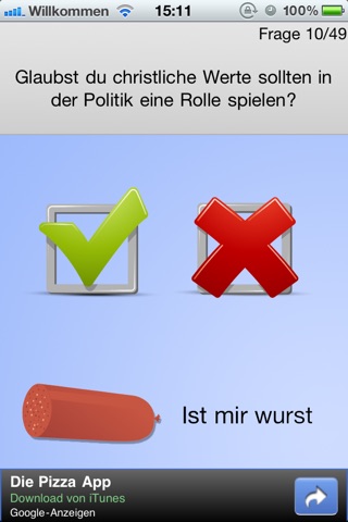 Dann ist diese App genau das Richtige für dich! In 49 Fragen zu den wichtigsten Standpunkten der Politik kannst du deine Meinung abgeben. Dabei rechnet das intelligente Wertungssystem deine Antwort direkt mit und vergleicht, welche Partei dieselbe Meinung vertritt.