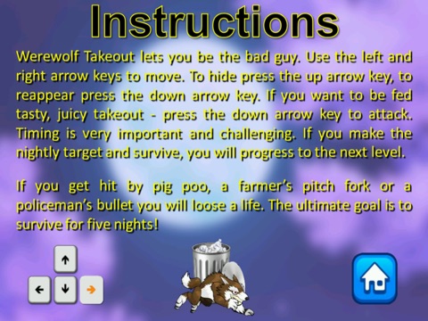 ‘Werewolf Takeout’ is a sim with a difference. You get to be the bad guy! Whatever you do, dont let the villagers reclaim your park. Its Friday night and its takeout night. No more hiding in the shadows. Each night you survive, the challenge of keeping your park all to yourself becomes more difficulty. Feeling Hungry? How much takeout can you deliver?