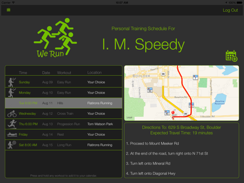 Quickly access your training schedule. With a single tap or two, see the details of todays workout along with a map, driving directions, and driving time. Your entire weeks training schedule is also readily available. Add any workouts to your personal calendar with the tap of a finger.
