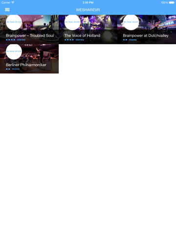 The WeShareVR app is a Virtual Reality viewer which allows users to experience the world of Virtual Reality on their own smartphone. Experience concerts, visit beautiful places in the world and stand on stage with your favorite artists as if you are really there.
