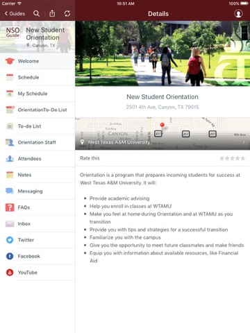Get in touch, stay-in-the-loop and find out what’s happening on campus with the West Texas A&M University App. Connect to WT Social Media and find guides for important steps in your journey at WT. This app will help you navigate everything from special events and orientations to welcome week, homecoming, career fairs and more. It gives you the information you need for a fast and efficient student experience.