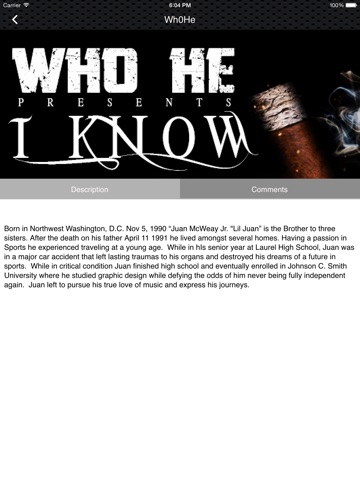 Download the Wh0He App for all the latest music and fashion. Complete with events, videos, pics and more. Born in Northwest Washington, D.C. “Juan After the death on his father April 11 1991 he lived amongst several homes. Having a passion in Sports he experienced traveling at a young age. Juan was in a major car accident that left lasting traumas to his organs and destroyed his dreams of a future in sports. While in critical condition Juan finished high school and eventually enrolled in college where he studied graphic design while defying the odds of him never being fully independent again. Juan left to pursue his true love of music and express his journeys.