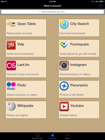 To select a map location simply long-touch the map and the application will pin your choice and start fetching data from the following sources: Facebook, Flickr, Instagram and Panoramio pictures, Last.fm events, Foursquare, Google Places, Wikipedia and Yelp places, YouTube shared videos.
