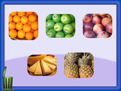 Before your child drags the picture to the trash can, expand the learning experience by asking your child to identify WHY the picture does not belong and WHAT the other pictures have in common. For one picture to "not belong," the other four pictures must having something in common. For example, "The cheese does not belong because it is not a fruit." If your child needs assistance, offer a choice (i.e. “Is it a fruit or a vegetable?”). Help your child gain a clear understanding before moving on to the next question.