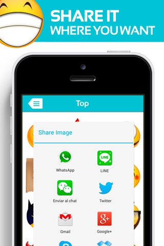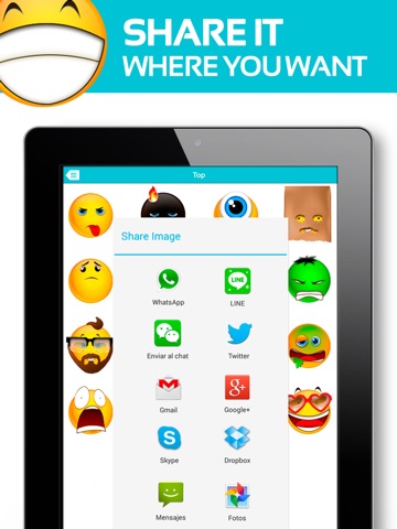 ● You can share these emoticons in your messages and the status of Whatsapp, Line, WeChat, Facebook, Twitter, Viber, Telegram, ChatOn, Tuenti, SpotBros, GroupMe, Joyn, etc.