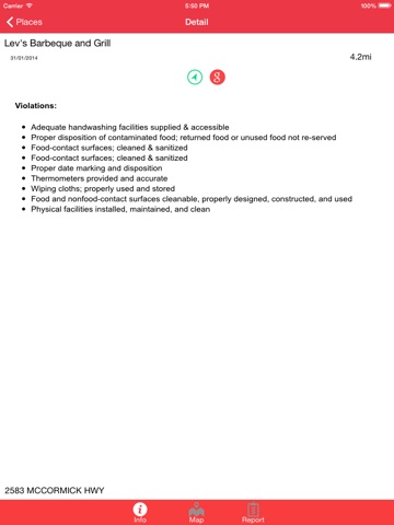 What The Health lets you easily view Health Inspection Scores for Restaurants, Hospitals, and Bar Establishments in the State of Georgia. This multi-functional app allows you to quickly view Georgia Health Scores for every Restaurant near you. Not only can you view Health Inspection Scores for restaurants in Georgia, you can get directions and share scores with friends on Facebook!