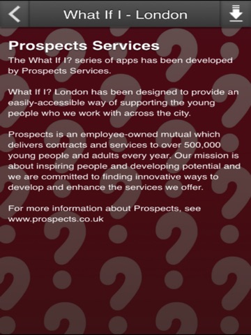 What if I? is an app for young people which answers all the important questions in life. Providing answers to almost 100 What If I? questions about money, health, relationships and many other areas, the app has been designed by Prospects Services for young people in London.