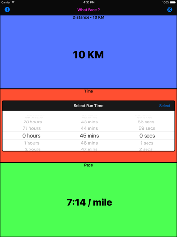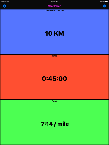 There are 3 distinct panels that the user can interact with - distance, time, and pace.