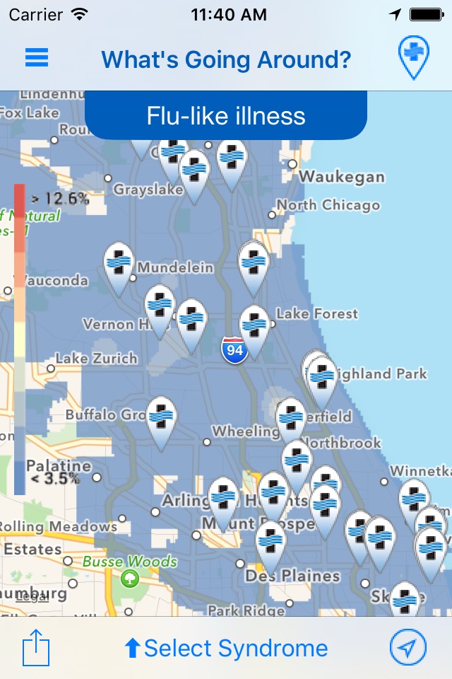 WGA is a graphical representation of particular illness/syndromes trending across NorthShore University HealthSystem in Chicago’s northern suburbs that is updated daily. Users can track syndromes such as strep throat and flu-like illness and see where cases are most prevalent. Based on daily patient data collected across our health care system, a geospatial heat map is generated for each syndrome that corresponds to the fraction of patients presenting that are positive (prevalence) for the syndrome of interest at a particular geographic location. Using historical data, the current prevalence can also be equated to an overall High, Medium, or Low for the entire region
