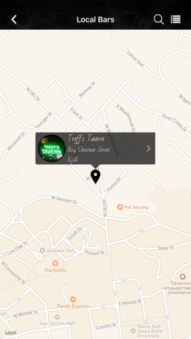 Local bars: Shows the name and location of each bar in the area as wells as address and directions from your current location.
